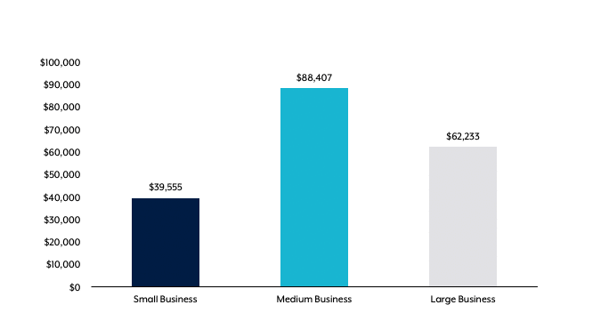 - Medium-sized businesses had the highest average loss per cybercrime report where a financial loss occurred. The cost per cybercrime report on average increased to 14 percent, to over $39,000 for small businesses, $88,000 for medium businesses, and over $62,000 for large businesses.